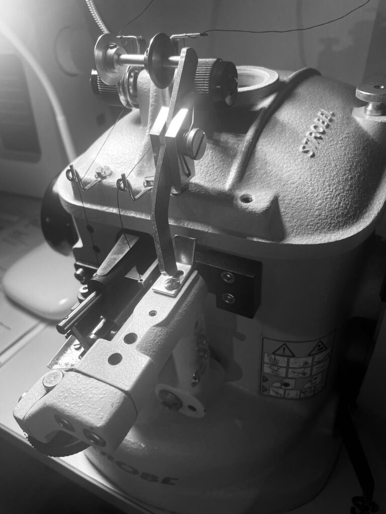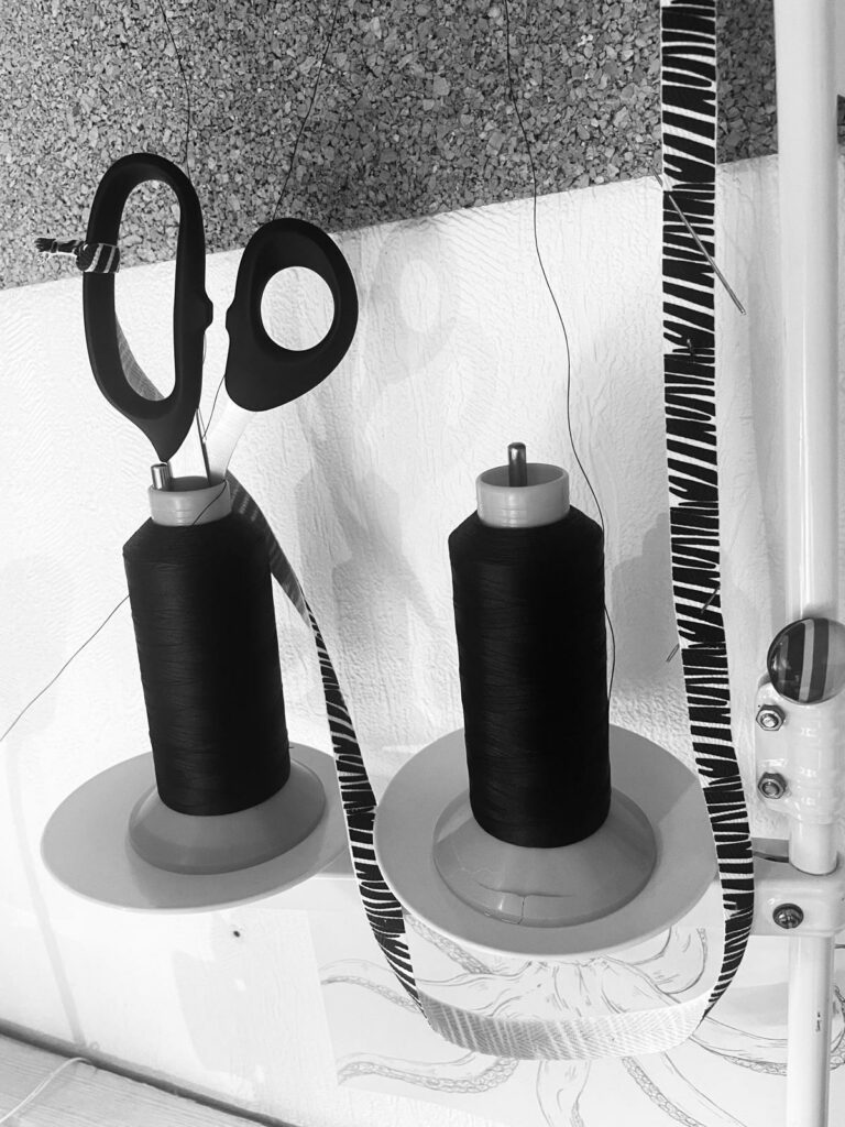 Le fil utilisé est adapté: il est anti UV, résistant à l’eau et au sel et aux produits chimiques (colle néoprène, chlore). Il est également résistant à l’abrasion tout en permettant une légère élasticité pour s’adapter aux mouvements. Enfin, il a une adhérence excellente au néoprène.